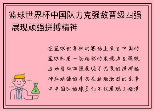 在篮球世界杯的赛场上,来自中国的篮球队用一场精彩的表现力克强敌,成功晋级四强,展现了无畏的拼搏精神和顽强的斗志。在这场激烈的竞争中,中国队的球员们不仅展现了精湛的技艺,还用强大的团队合作和坚韧的心理素质,克服了重重困难,最终突破了自我,取得了历史性的突破。本文将从四个方面对中国队如何力克强敌、晋级四强进行详细阐述,并展示他们在比赛中的顽强拼搏精神。首先,我们将分析中国队在比赛中的关键战略和战术部署,接着探讨球员们的个人表现及团队合作,第三部分将重点分析中国队如何在困难时刻逆转局势,最后我们将对中国队的拼搏精神进行总结,展现他们在赛场上的英勇表现。