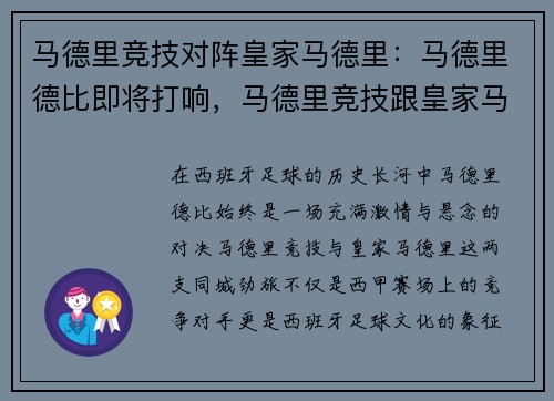 在西班牙足球的历史长河中,马德里德比始终是一场充满激情与悬念的对决。马德里竞技与皇家马德里,这两支同城劲旅,不仅是西甲赛场上的竞争对手,更是西班牙足球文化的象征。无论从历史、荣誉还是球迷基数来看,这场比赛都堪称举世瞩目。