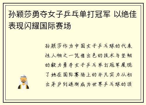 孙颖莎作为中国女子乒乓球的代表性人物之一,凭借出色的技术与坚韧的毅力,勇夺女子乒乓单打冠军,展现了她在国际赛场上的非凡实力。从初出茅庐到逐渐成为世界乒乓球的顶尖选手,孙颖莎的表现无疑是令人瞩目的。本文将从四个方面对孙颖莎的表现进行详细分析:她的技术优势、心理素质、训练与备战过程,以及她对乒乓球运动和国际赛场的影响。通过这些方面的剖析,我们不仅能更加全面地了解孙颖莎的成功之道,还能从中看出她作为顶级运动员背后付出的努力与决心。