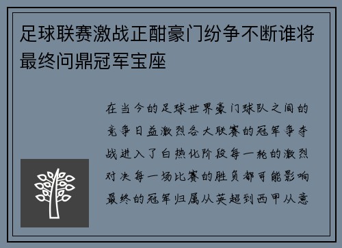 通过对豪门球队之间的实力对比、赛季走势、直接对决以及外部因素的分析,我们可以看到,足球联赛中的冠军争夺并非单纯由某支球队的强大实力决定。各大豪门球队的竞争之激烈,每一场比赛的胜负都可能影响最终的冠军归属。