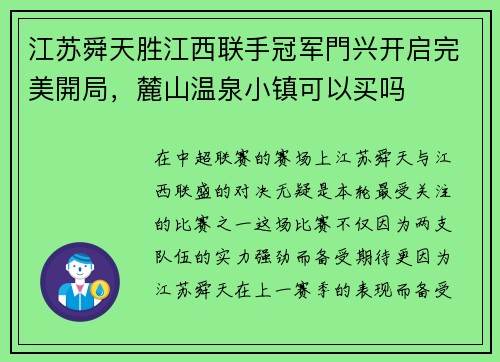江苏舜天与江西联盛的比赛不仅是一场精彩的对决,更是江苏舜天新赛季的完美开局。江苏舜天的胜利不仅让球迷们看到了他们的实力,也让冠军门兴的联动表现得更加突出。江苏舜天与冠军门兴的联动,无疑会让他们在新赛季中更加不可阻挡。我们期待江苏舜天与冠军门兴在新赛季中再创辉煌,为球迷们带来更多精彩的比赛。